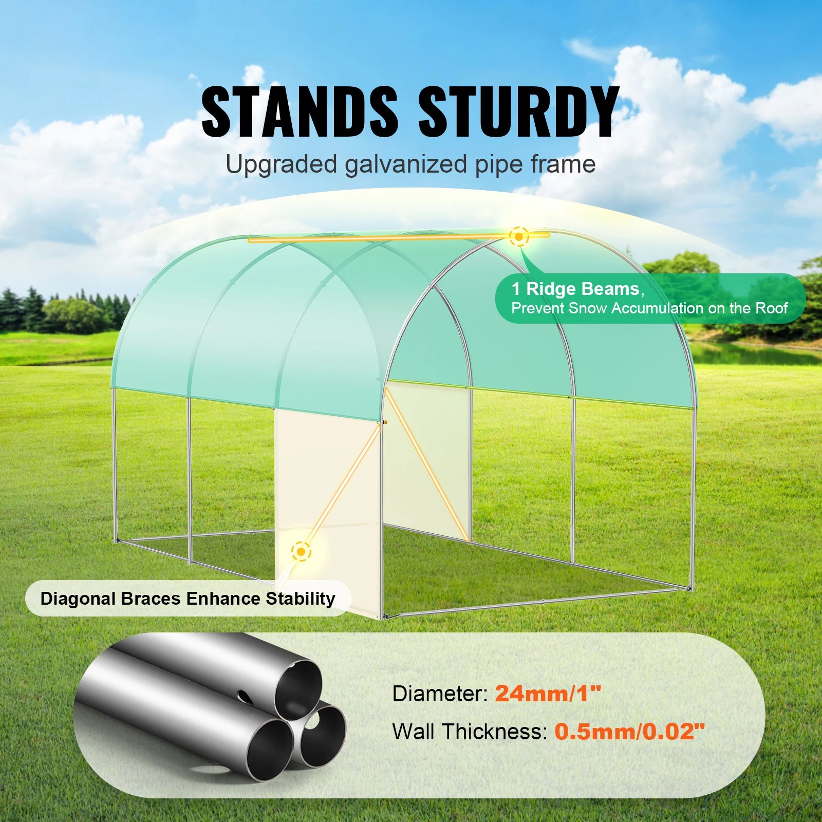The upgraded 24mm/1" thickened steel pipes with a 0.5mm/0.02" wall thickness, combined with U-shaped stakes and plastic hooks, ensure a more stable greenhouse structure. The high tunnel greenhouse easily withstands severe weather, preventing deformation and collapse.